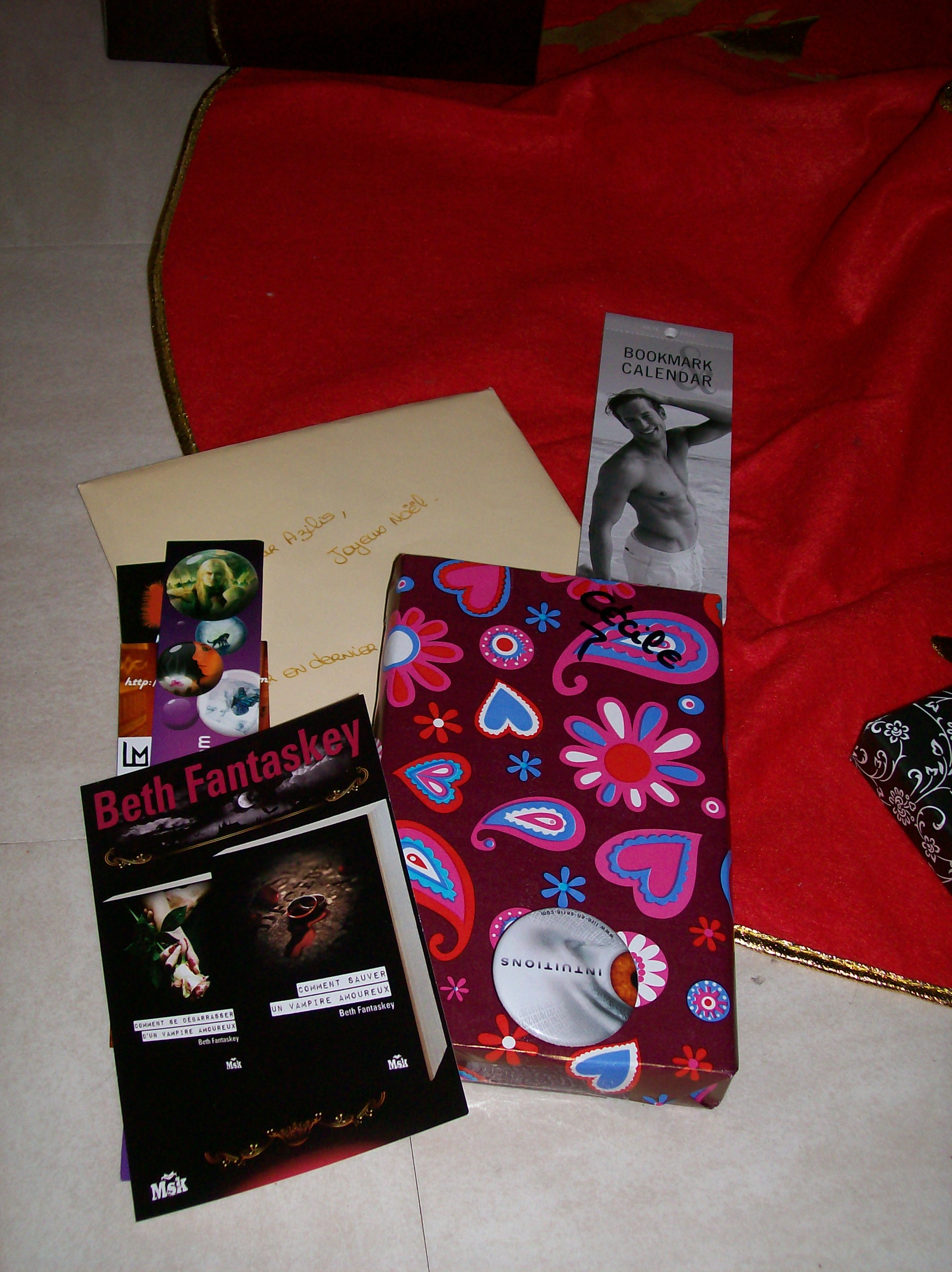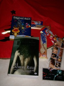 Alors, il y avait une jolie carte de Noël avec un renne très sympathique!, des mp maison avec pleins de gourmandises (macarons, chocolat…) et un spécial « Femmes de l’Autremonde » (série que j’ai découvert il n’y a pas longtemps mais que j’adore!! il me servira pour ma lecture du tome 2). Il y avait aussi (oui au passé car… et bien…. comment dire…. ils sont déjà mangés!^^) deux sucettes père noël en chocolat, et de barres de chocolat Galak speculoos (une vraie tuerie!! malheureusement ça ne se trouve qu’en Belgique apparemment! 😦 ).Et en livre, elle m’a offert la suite des aventures d’Anita Blake!!