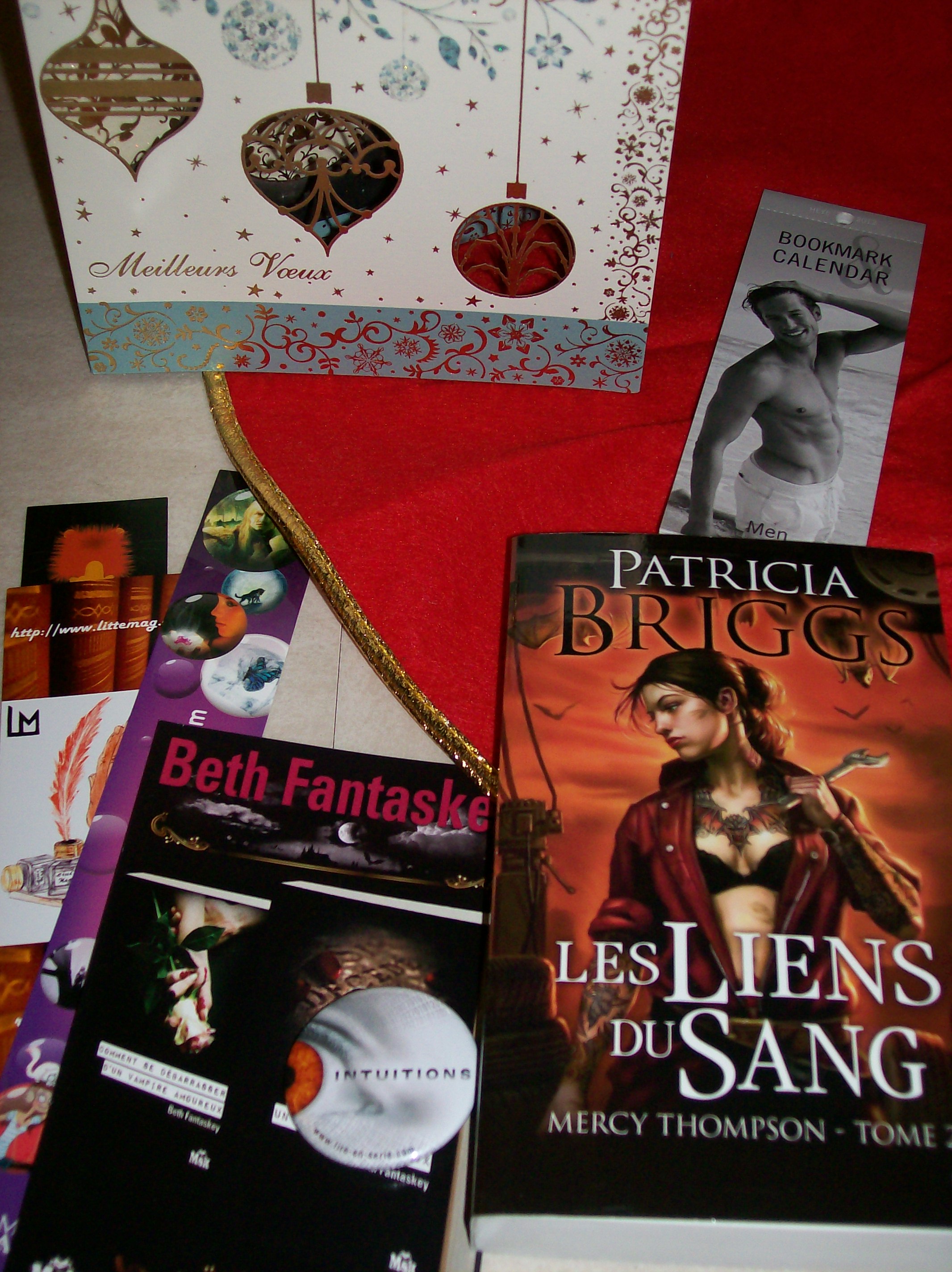 Comme vous pouvez le voir, c’est une chouette enveloppe! J’y ai trouvé un badge Intuition, une carte publicitaire de la série Comment sauver un vampire de Beth Fantaskey, des mp, des mp spécial « beaux mecs qui font baver sur les livres », une superbe carte de vœux et enfin un livre le tome 2 de Mercy Thompson pour qu’on puisse continuer notre lecture commune de cette série!