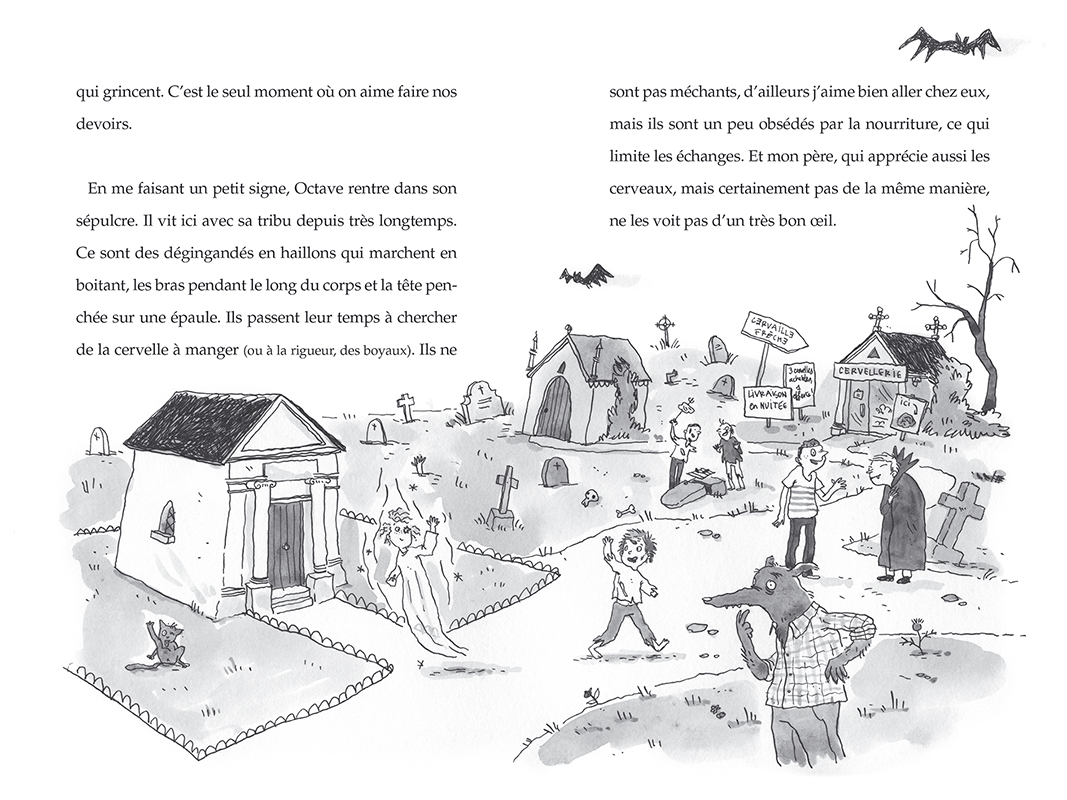 J’ai beaucoup ri dans cette lecture morbide! Chrysostome Gourio a énormément d’humour. Beaucoup de blagues, de clins d’œil, d’humour noir. J’y ai été vraiment sensible. On s’amuse vraiment pendant cette lecture. La plume de l’auteur est inventif, pétillante, décalée, vivante (oui bizarre quand on sait le thème). Son petit monde s’anime sous nos yeux. Et les illustrations d’Eglantine Ceulemans (dont j’avais déjà apprécié le coup de crayon dans Carambol’anges) sont toutes aussi jubilatoires!