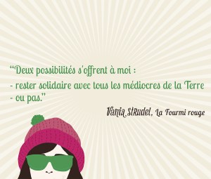 J’ai ri mais j’ai ri avec ce roman! Vania est vraiment exceptionnelle! J’ai adoré son humour, le regard qu’elle porte sur elle-même et sur les autres. J’ai vraiment interagi avec cette histoire : rire, étonnement, colère face à cette ennemie jurée (c’est vraiment une « crevure poufiasse »). Les personnages secondaires ne sont pas en reste : uniques eux aussi, et qui complètent le tableau à merveille!