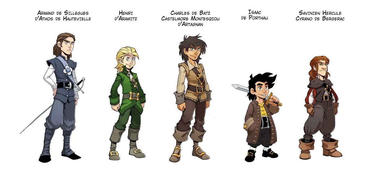 Fabien Dalmasso réécrit à sa façon, c’est-à-dire avec beaucoup de liberté, l’histoire des trois mousquetaires. Alors on retrouve le roi, Richelieu, Rochefort, mais on fait la connaissance des mousquetaires que l’on connaît mais adolescents. Leurs grands frères ou père étant les mousquetaires du moment. Alors que ces derniers ont été fait prisonniers à Toulouse, Henry d’Aramiz, le fils de l’un d’entre eux, et son ami Isaac de Porthau partent quérir l’aide du roi. En chemin ils rencontreront le Duc de Nevers ainsi que le futur D’Artagnan, Athos et un certain Cyrano. ensemble, ils partent affronter leur première mission et sous nos yeux nait leur complicité légendaire (ainsi que leur cri de ralliement).