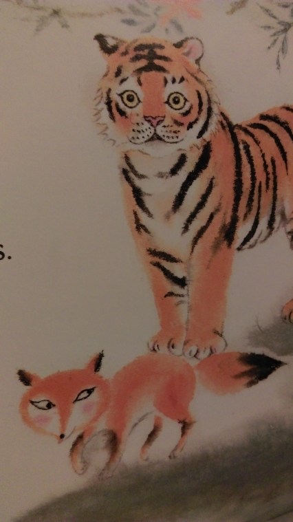 On retrouve ici le schéma type des fables avec une jolie morale finale. L’enfant s’amusera sans peine de la répétition des différentes scènes d’approches (les gazelles, les girafes ou autres zèbres…). L’effet de répétition aidera à la fois à la compréhension de ce qu’il se passe et à l’humour de la situation. Une histoire qui est donc très agréable à découvrir, avec des illustrations qui font rêver. Mais il y a un petit soucis pour moi dans cet album… les tigres ne vivent pas sur le même continent que les girafes ou les zèbres!