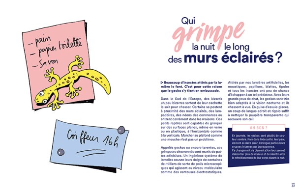 J’aime vraiment beaucoup cette petite collection chez Salamandre : elle est à la fois ludique et instructive. Baptisée « Antisèches pour parents en détresse », elle aidera les parents à répondre aux multiples questions de leurs petites têtes blondes et pourquoi pas à briller en société !On pourra ainsi expliquer pourquoi parfois la ligne baveuse de l’escargot est en pointillés et non en ligne droite! Vous savez pourquoi vous ? Et bien moi je l’ai appris avec ce petit livre : en fait , l’escargot est en mode économie d’énergie. Sa bave étant composée à 98% d’eau, il économise son précieux carburant en zone aride! Astucieux non ?