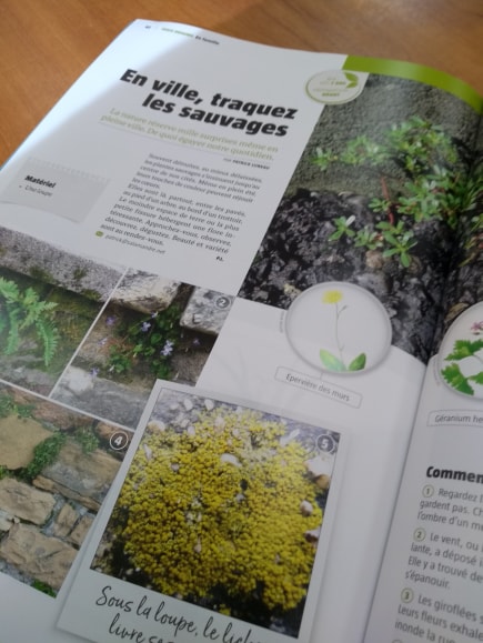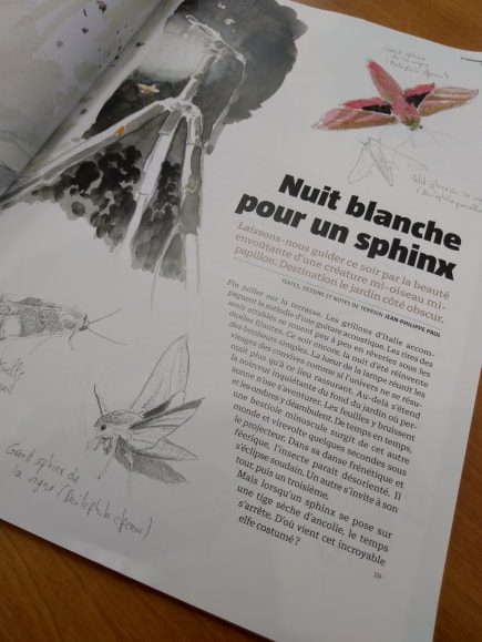 On trouve ensuite d’autres trésors dans le magazine : un reportage sur le sphinx, avec de belles esquisses à l’aquarelle, un témoignage autour du lièvre variable, un focus sur l’artiste franco-japonais Tsunéhiko Kuwabara qui crée un bestiaire de bronze, ainsi qu’un court reportage sur quelques fleurs sauvages que l’on peut trouver en ville.