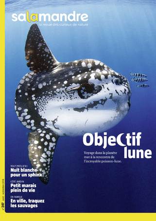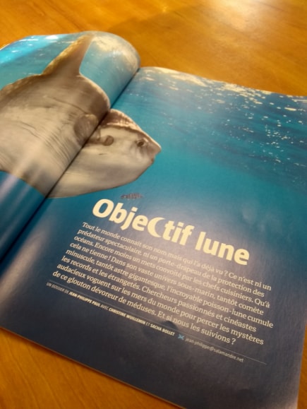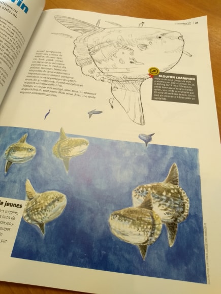 En effet, le dossier du bimensuel concerne un poisson que je ne connaissais pas du tout : le poisson-lune ou Mola. Une véritable découverte pour moi, et au final j’ai été fascinée de bout en bout par le document proposé. J’ai appris à connaître son histoire, son environnement, ses habitudes, notre pollution qui le menace… et je me demande encore comment j’ai pu passer à côté de ce poisson qui peut atteindre les 1m 80 et les 1000 kg! C’est un monstre des mers placides, non comestibles mais mis à mal par la pêche. 26 pages instructives, riches et surprenantes! Je me revois entrain de lire cette article avec mes yeux écarquillés par la beauté de cet animal sous-marin extraordinaire !