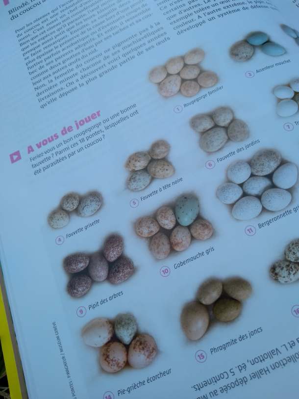De la migration à la nidification, l’article est une mine d’information. J’ai ainsi appris qu’il imitait l’épervier, et qu’il pouvait même changer de couleur pour brouiller les pistes. Les femelles sont prêtes à tout pour pondre leur nid chez quelqu’un d’autre (entre 9 et 20 œufs au rythme d’un tous les deux jours!)! Rouge-gorge, troglodyte mignon, bergeronnette, pipit… elle n’a pas de cible préférée. Ses petits bénéficieront de la chaleur de la couvée des oiseaux parasités et ils seront même nourris au même titre que les petits d’origine (qui ne survivent pas à la naissance des petits coucous, qui les éjectent du nid dès sa naissance!)