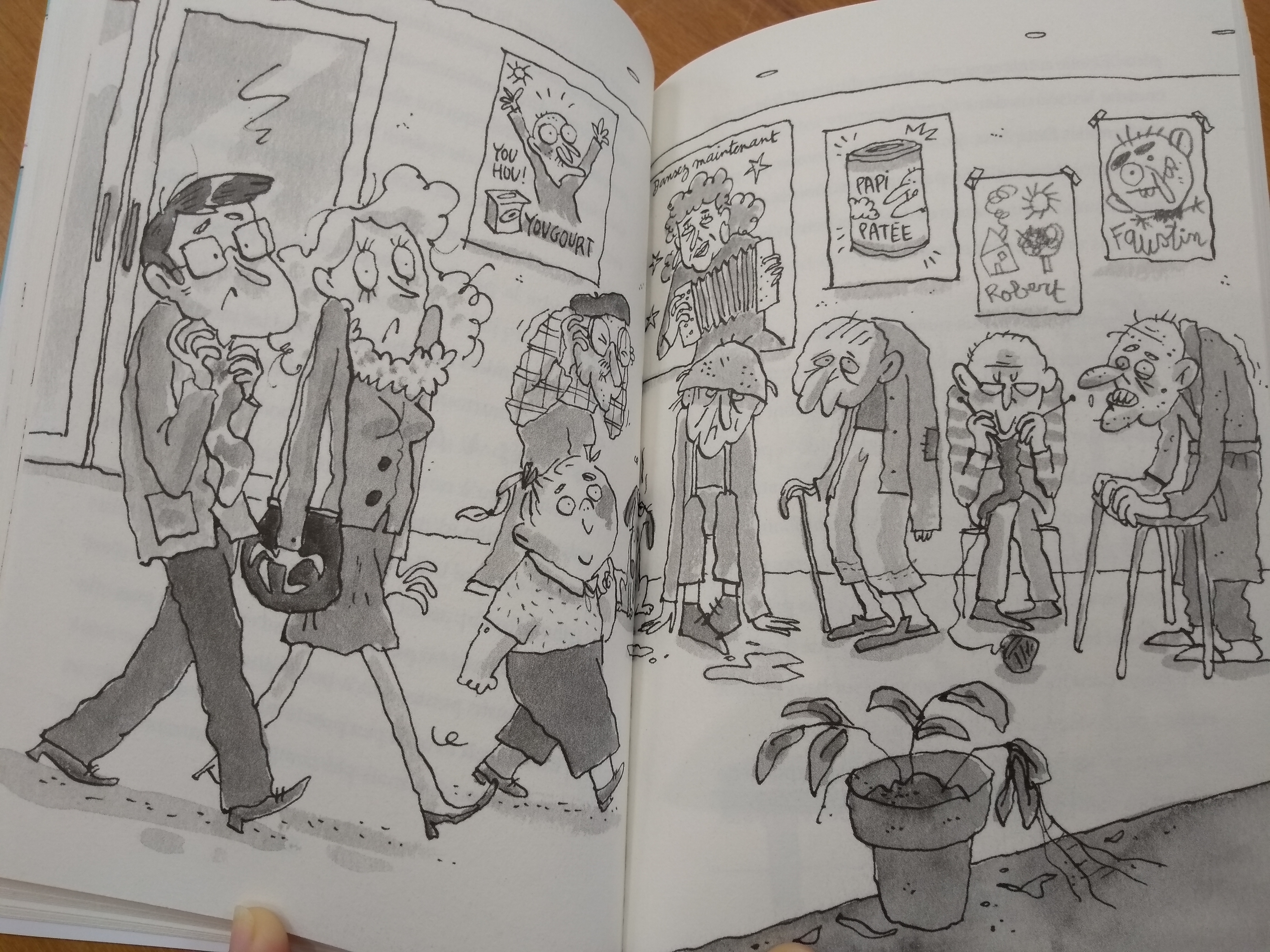 Et elle obtient gain de cause. Les voilà donc à la SPA, mais pas celle qu’on connaît le plus, l’autre : la Société des pépés à Adopter! Et il y en a pour tous les goûts : des bancales, des sans-poils, des baveux, des endormis, des qui puent… Bref, l’embarras du choix! Et Sérieuse choisit un modèle qui aime râler, faire des mauvais coups… peut-être bien le pire des pépés!
