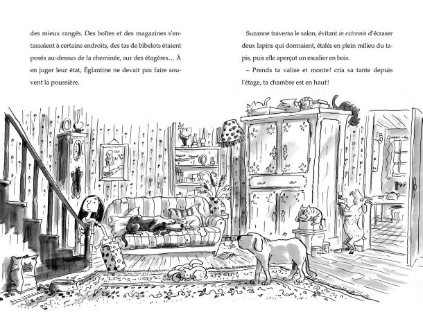 Suzanne a un gros gros gros problème ! Ses parents l’envoient passer quelques jours de vacances chez sa tante Eglantine. Elle n’en a pas du tout envie et n’a pas réussi à les convaincre qu’elle pouvait tout à fait rester seule à la maison et comme ça elle pourrait lire toute la journée (le rêve!!). Mais pour ces parents il en est hors de question et de toute façon ils trouvent qu’elle lit beaucoup trop! Alors hop direction la campagne et la vie à la ferme! Et même si elle avait emprunté dix-huit romans à la médiathèque, qu’elle avait rusé pour les emporter, sa mère l’a découvert! Elle n’a pu prendre qu’un seul roman… pour 15 jours (quelle horreur! là j’ai bien compatis à sa douleur de lectrice addictive j’avoue!!). Arrivée chez Eglantine, elle découvre l’univers qui va être le sien la ferme, les animaux (oups! attention de ne pas marcher sur le lapin!), la boue… la solitude, le silence… l’ennui…