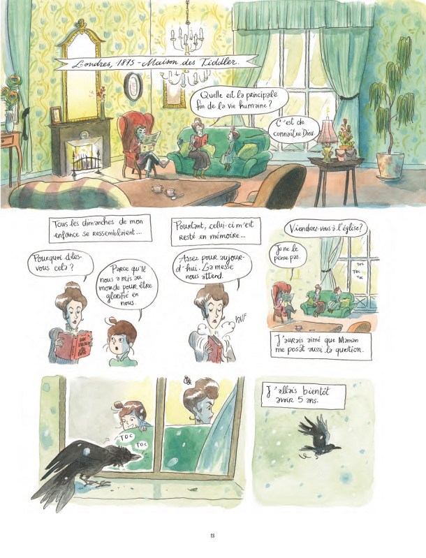 Ce premier tome aborde donc son enfance et le début de son adolescence, la naissance de cette curiosité scientifique, de son indépendance. Même si ses parents la délaissent, son père sait lui offrir les bons cadeaux (un microscope par exemple). Sa préceptrice trouvera le bon équilibre pour lui faire un enseignement adéquat. J’ai aimé la voir évoluer mais garder intact sa passion première. Et même si mes souvenirs sont lointains, cette adaptation le semble très fidèle au roman. En tout cas, une fois ouverte, je me suis plongée dans les différentes planches avec délectation. Les illustrations à l’aquarelle sont délicates, fines et pleines de vie comme c’est si bien le faire cette illustratrice. Il se dégage une poésie, un attachement tout particulier à cette jeune fille, à son univers et à la nature. Dans ce texte, on aborde également la place de la femme dans la société de cette époque, le rôle qu’elle doit jouer et la place qu’elle doit garder. Miss Charity va devoir apprendre à se battre pour obtenir ce qu’elle désire et réaliser son rêve.