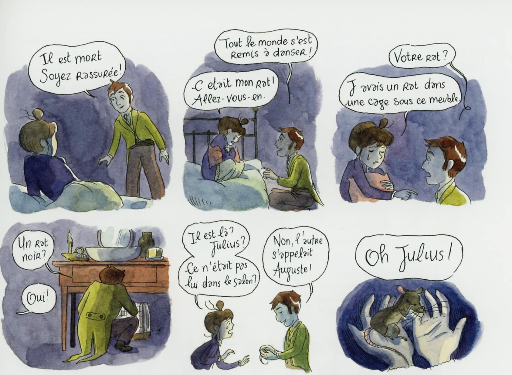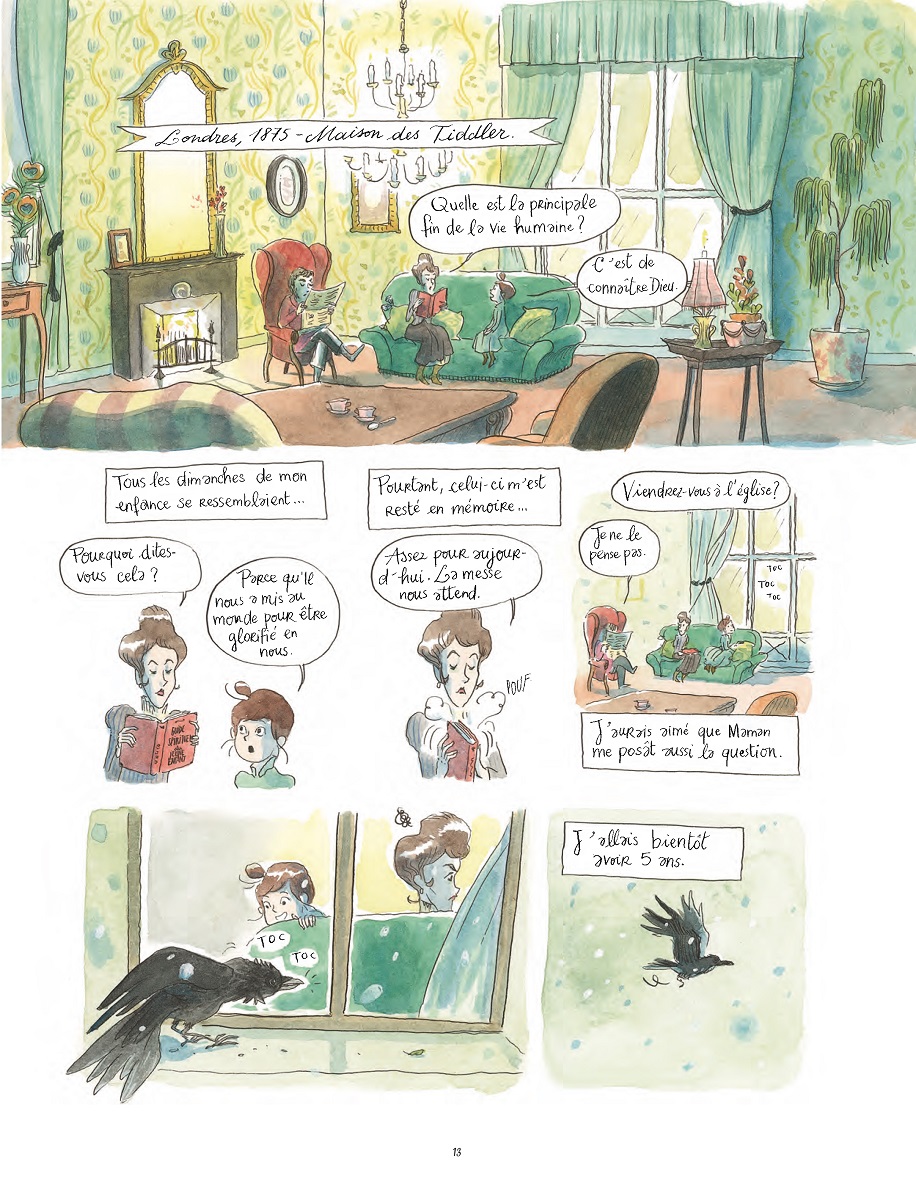 Ce premier tome aborde donc son enfance et le début de son adolescence, la naissance de cette curiosité scientifique, de son indépendance. Même si ses parents la délaissent, son père sait lui offrir les bons cadeaux (un microscope par exemple). Sa préceptrice trouvera le bon équilibre pour lui faire un enseignement adéquat. J’ai aimé la voir évoluer mais garder intact sa passion première. Et même si mes souvenirs sont lointains, cette adaptation le semble très fidèle au roman. En tout cas, une fois ouverte, je me suis plongée dans les différentes planches avec délectation. Les illustrations à l’aquarelle sont délicates, fines et pleines de vie comme c’est si bien le faire cette illustratrice. Il se dégage une poésie, un attachement tout particulier à cette jeune fille, à son univers et à la nature. Dans ce texte, on aborde également la place de la femme dans la société de cette époque, le rôle qu’elle doit jouer et la place qu’elle doit garder. Miss Charity va devoir apprendre à se battre pour obtenir ce qu’elle désire et réaliser son rêve.