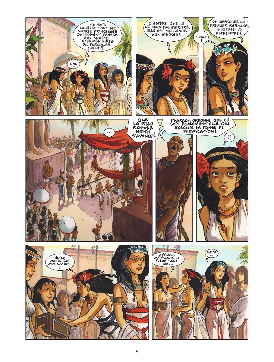 résumé Dans la ville de Saïs, en Égypte, la jeune Neith, fille de Pharaon, est remarquée par son père lors de sa danse pour un rituel sacré. Et contre toute attente, c’est elle qu’il choisit pour effectuer la danse de la purification. L’une de ses sœurs la met aussitôt en garde : il vaut mieux qu’elle échoue dans sa prestation si elle ne veut pas finir dans la couche de leur père…… Incapable de se ridiculiser devant tant de monde, Neith n’a plus d’autre choix que de s’échapper avec Sennedjem, son demi-frère, qui compte quitter discrètement le Palais.