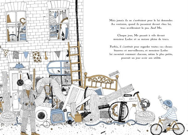 Le seul à qui ça plaît c’est le jeune Mo qui passe régulièrement devant chez Monsieur Leduc et qui regarde cette étrange collection avec des étoiles pleins les yeux. Un jour, Mo tombe et son vélo explose en mille morceaux. Déçu, il abandonne son vélo en pièce. Mais le lendemain, il le découvre réparé et avec des trucs en plus! Merci Monsieur Leduc! Avec tous ses trucs il a pu réparer un objet et même l’améliorer!