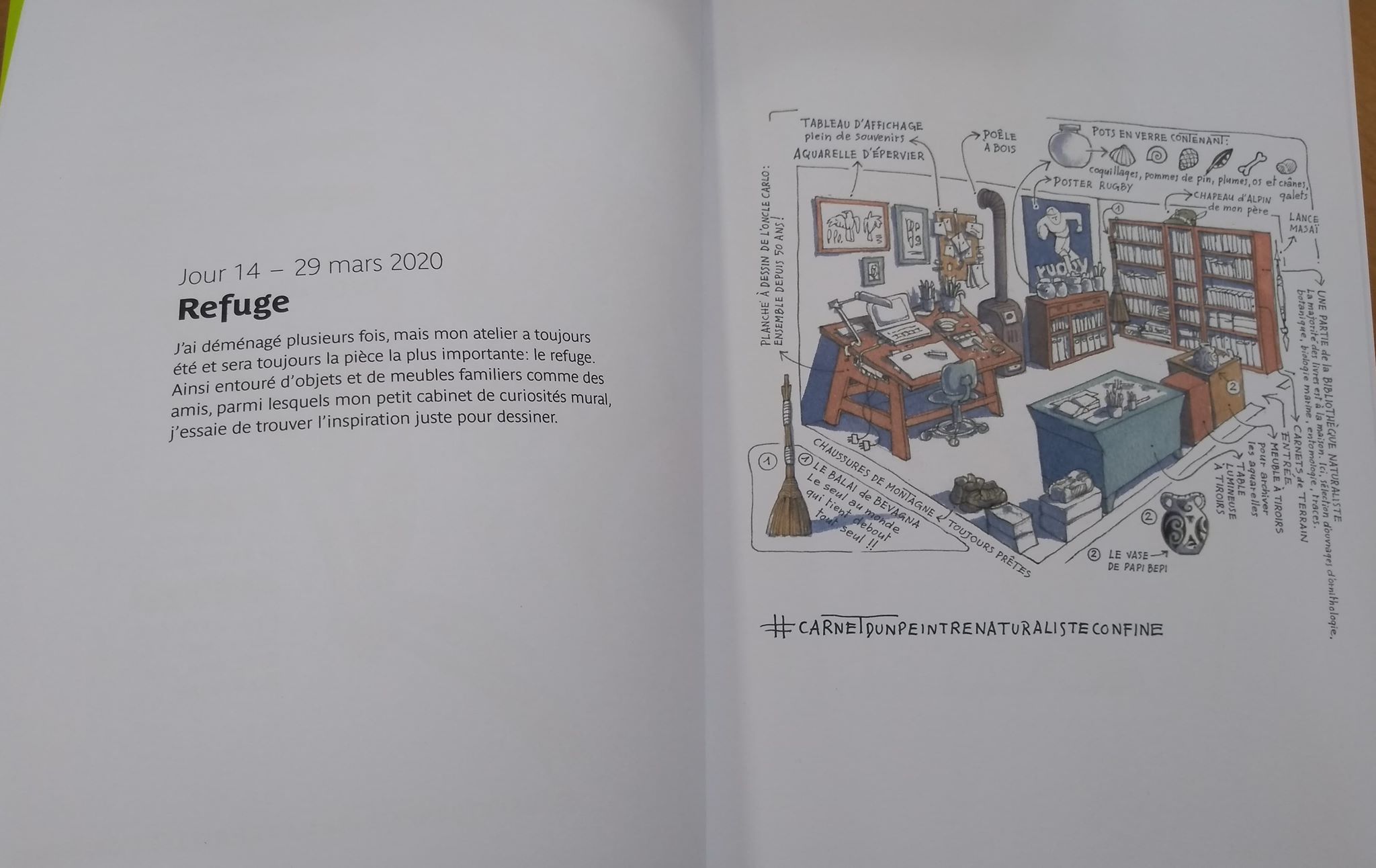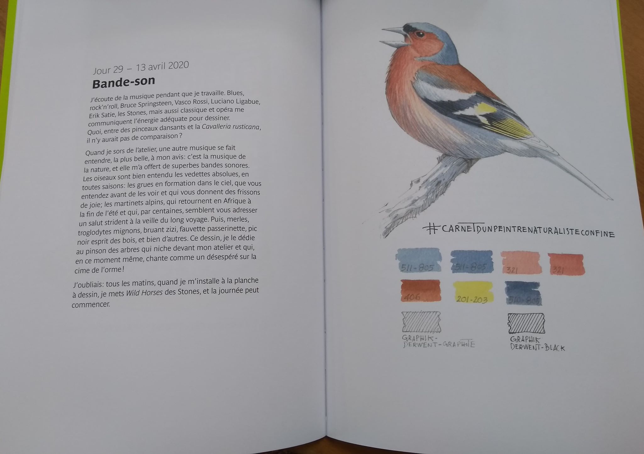Aujourd’hui j’aimerais vous parler d’un très beau carnet que j’ai pu feuilleter, lire savourer grâce aux éditions La Salamandre. Il s’agit d’un carnet qu’a tenu le peintre naturaliste italien Lorenzo Dotti durant le confinement (il vit au cœur d’un des foyers italiens des plus importants lors du début de la pandémie de la COVID-19, près de Turin, au nord de l’Italie) . Comme il l’explique dans l’avant-propos, l’angoisse, l’insécurité, l’avenir incertain ont rythmé la vie de chacun. Nombre d’artistes ont eu du mal à créer pendant cette période. Lui-même avait perdu sa concentration, son imagination… On peut sans mal imaginer que le travail d’un peintre naturaliste soit complexe quand on est amené à rester enfermé chez soi… Mais le 16 mars, un groupe Facebook lance un défi, un marathon de dessin (Trieste Sketchers). Une bouffée d’air frais pour l’artiste qui retrouve envie et plaisir de faire courir son crayon et ses pinceaux sur son carnet. Chaque jour un thème, une idée a développé. En carnettiste de tallent, Lorenzo Dotti y mêle mot et aquarelles.