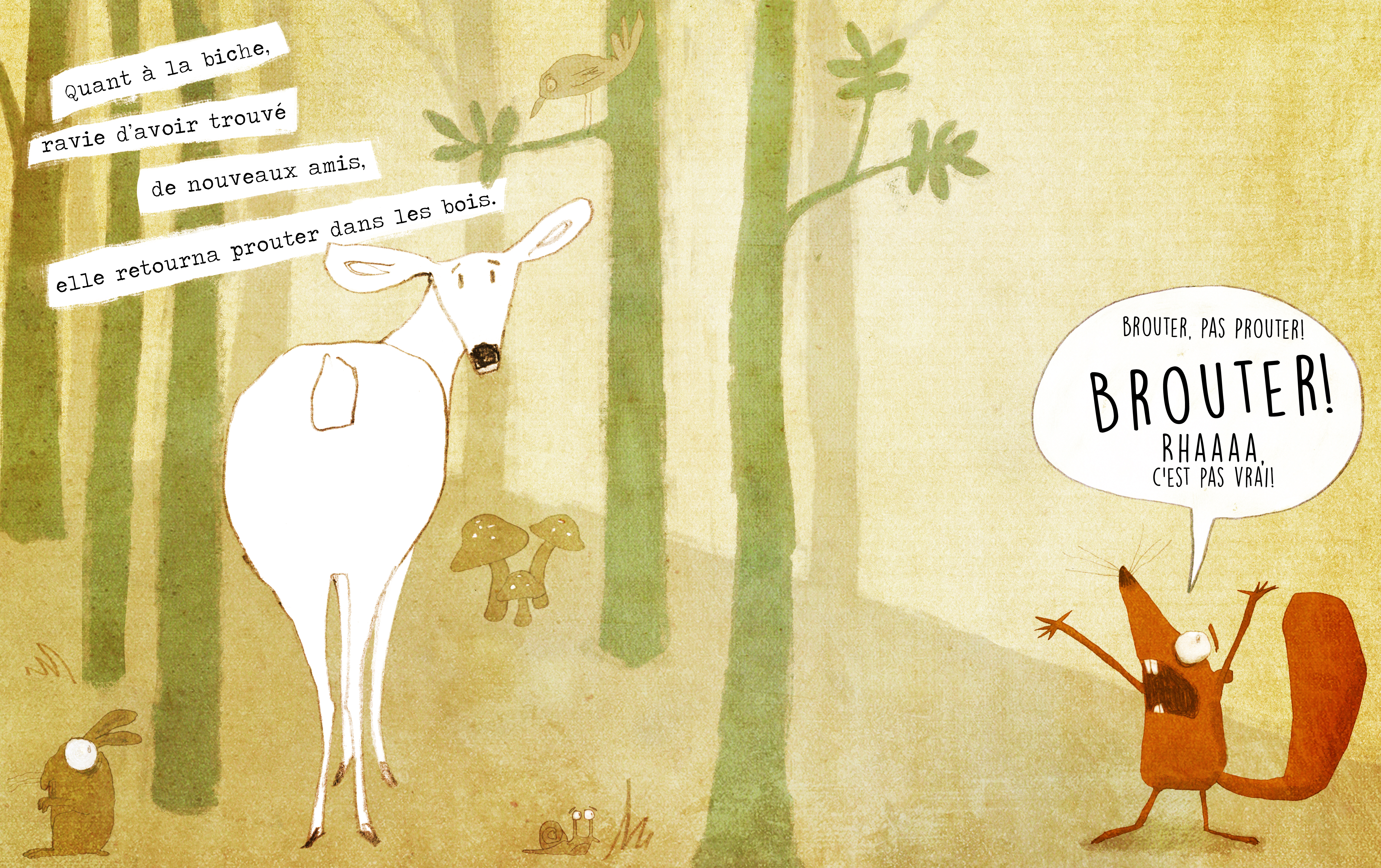 Kris Di Giacomo accompagne l’énergie créatrice du personnage de Michaël Escoffier, en illustrant ce récit épique en arrière plan, en blanc et beige/marron. On peut ainsi suivre à la fois par écrit et par les mots les erreurs linguistiques! Comme quoi il est important d’utiliser les bons mots, de les utiliser à bon escient car cela représente un risque de compréhension ainsi qu’un risque pour les personnages de Robear !!