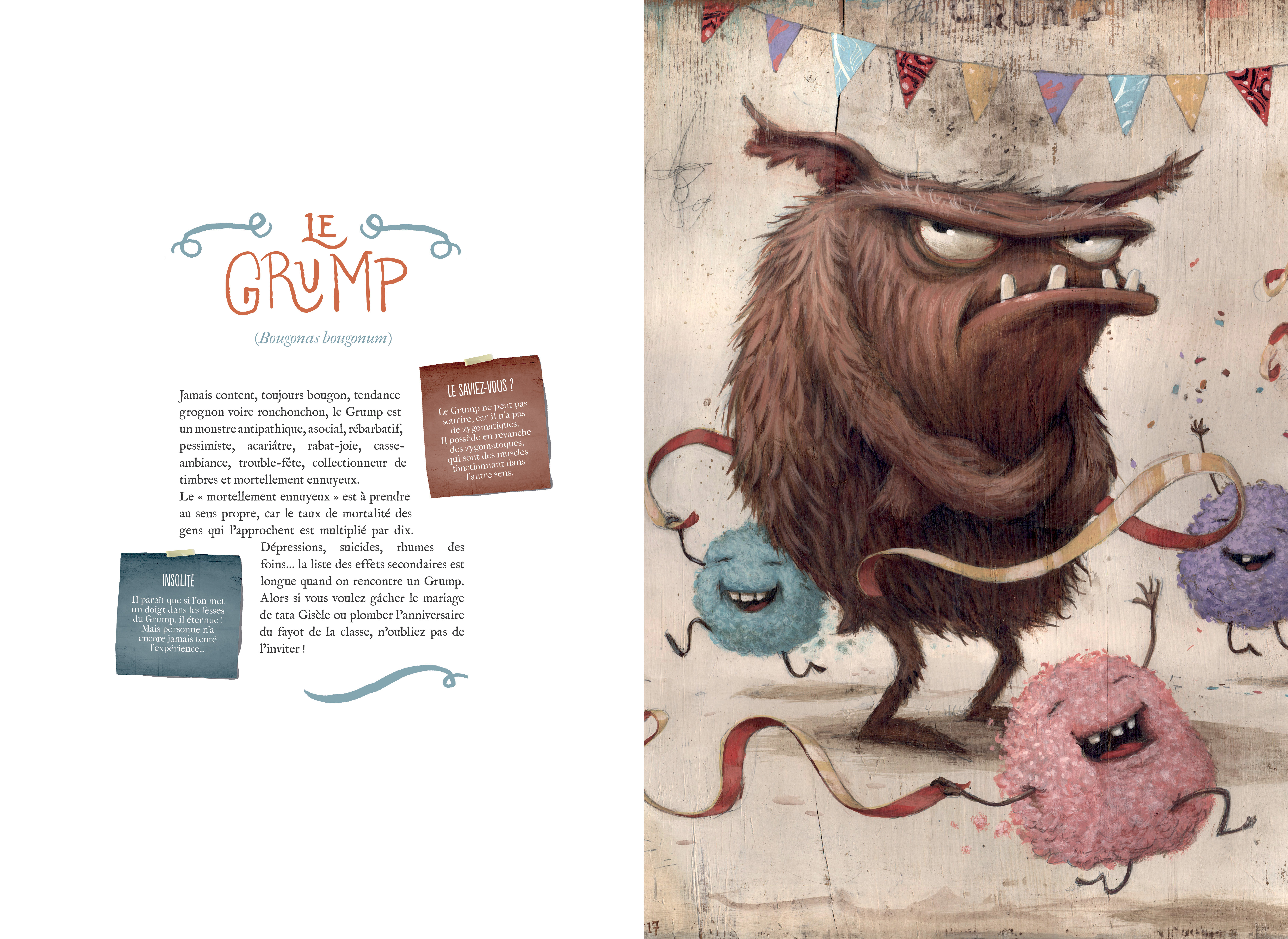 Vous allez donc faire connaissance avec le Tartanouille boiteux qui a un pied plus petit que l’autre car c’est plus facile pour tourner en rond quand il s’ennuie, les Gouglouttes qui habitent tous les cartables des écoliers, le Pipirouti ou autre Guffon… Bref, vous allez être incollable !