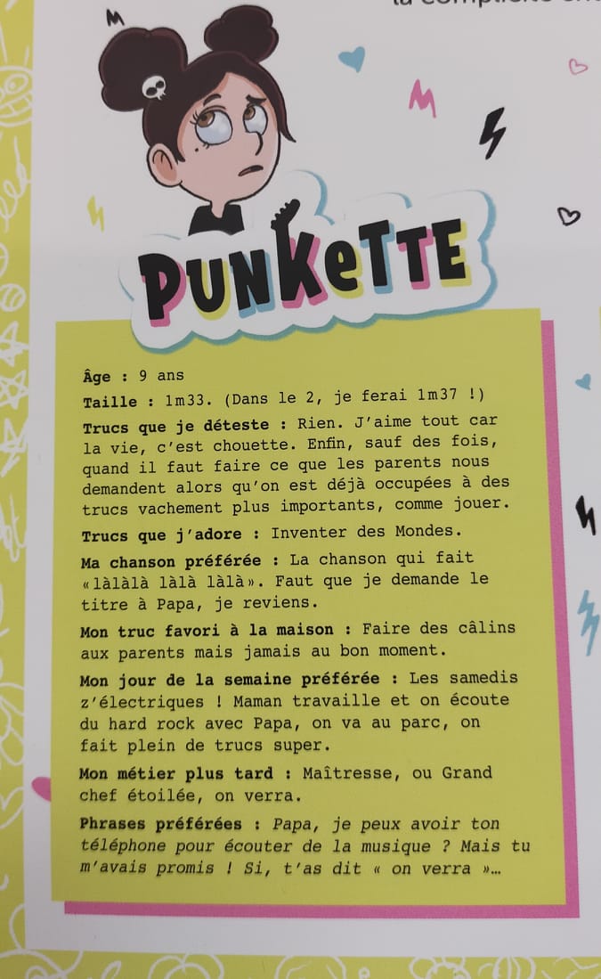 Les samedis chez elles sont z’électriques ! Maman travaille et elles passent la journée avec leur père à jouer, rêver, imaginer, « se discuter », à écouter du hard rock, à aller au parc! Les samedis sont épiques dans cette famille! Surtout que nos deux chipies débordent de vie ! Nola, 9 ans, alias Punkette et Vinca, 7 ans alias Poupoune, ont deux caractères entiers et explosifs. Ensemble, elles vivent 1001 aventures, même une brosse à dent est un prétexte à imaginer une histoire, un jeu ou à se disputer! évidemment! Mais même si ça râle et crie beaucoup on sent bien que ces deux là s’adorent et s’ennuieraient l’une sans l’autre !
