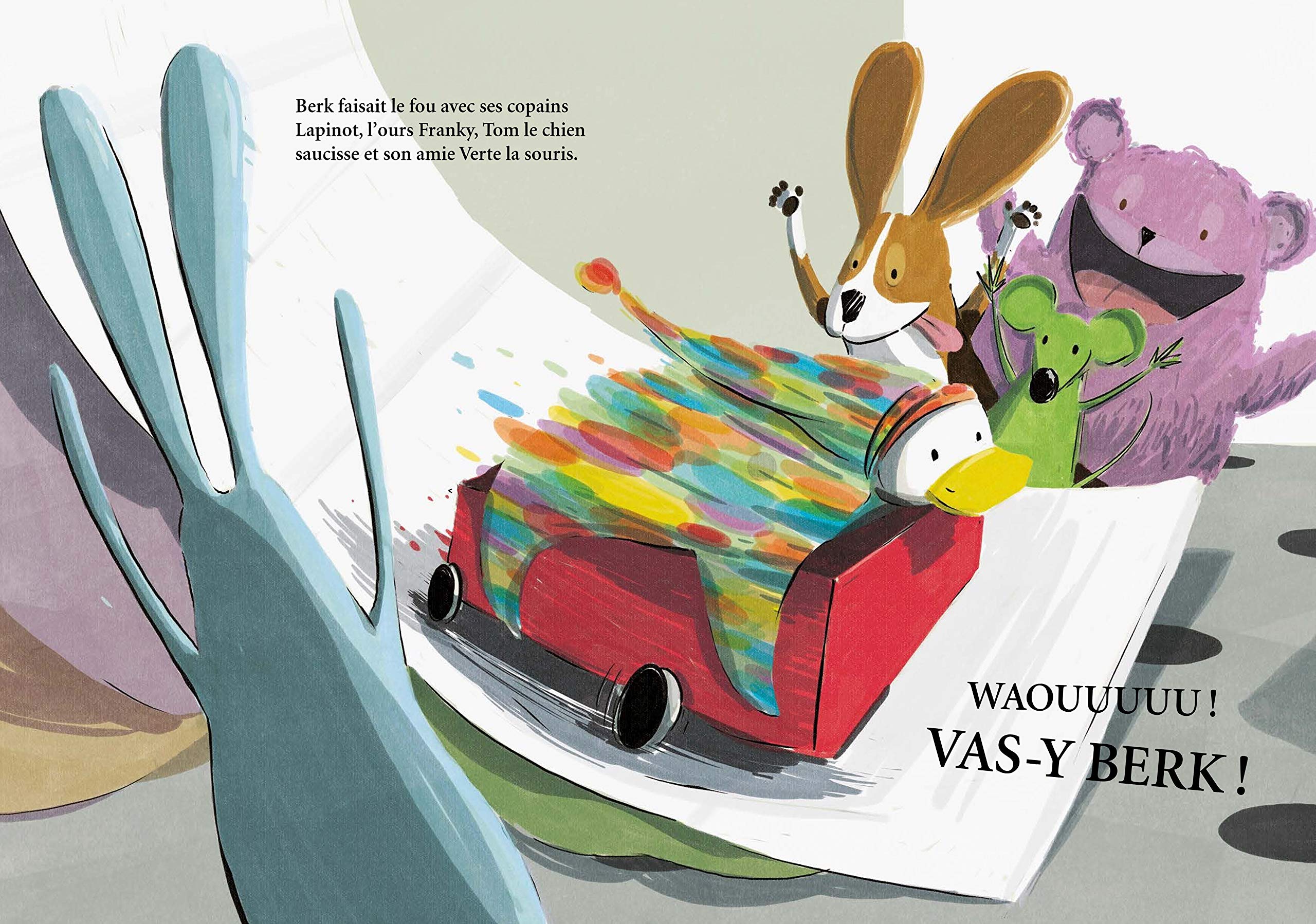 L’autre jour, un truc terrible est arrivé dans ma cuisine. C’est Berk, mon canard, qui me l’a raconté. Berk faisait le fou avec ses copains Lapinot, l’ours Franky, Tom le chien saucisse, et son amie Verte la souris. Quand soudain… PAF ! TCHAK ! OUCH ! Berk s’est relevé et a regardé ses amis : « Vous en faites une tête ! » C’est rien, juste l’œil de Berk qui a sauté dans la cuisine.