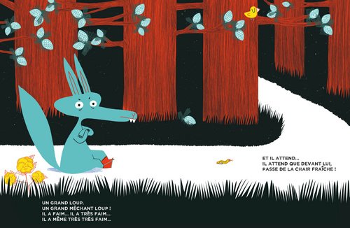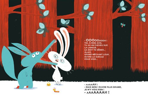 Construit sous la forme d’un conte de randonnée, le comique de situation se répète et crée donc l’attente et l’amusement du lecteur. Ce loup est un peu nigaud et ne voit pas que les lapins le font marcher. Il fait confiance devant tant de gentillesse ! Un joli message pourtant mais ça se retourne pourtant contre lui !