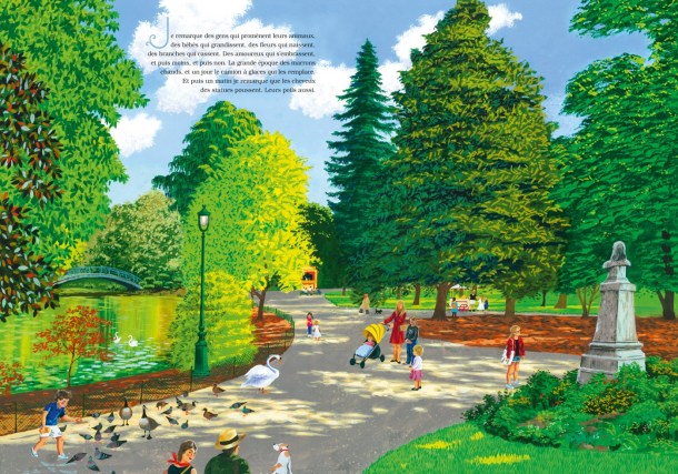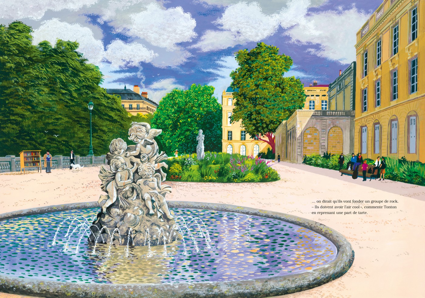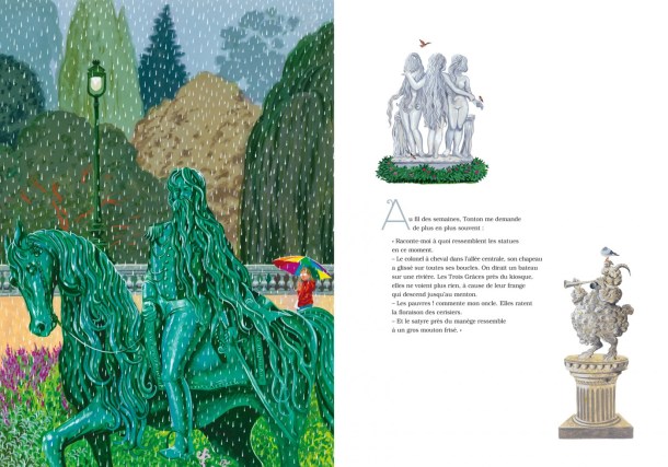 Une fillette traverse le parc chaque jour pour rendre visite à son oncle malade. Elle observe les bébés qui grandissent, des amoureux « qui s’embrassent, et puis moins, et puis non », des branches qui cassent. Il y en a des choses à voir au jardin ! Et puis elle remarque autre chose : les cheveux des statues poussent ! Oh, lentement, il faut faire bien attention pour le voir… Au fil des mois, elle raconte ainsi la vie secrète du jardin à son oncle. Mais au printemps, rien ne va plus. On dirait que les chérubins de la fontaine vont fonder un groupe de rock et les Trois Grâces près du kiosque ont la frange qui descend jusqu’au menton ! Une dame du parc s’étonne : mais que fait le coiffeur ? Comment ça, le coiffeur ?