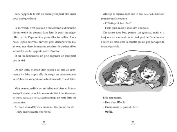 Le deuxième volet d’une série phénoménale, tendre, follement drôle, à l’esprit loufoque et piquant, qui raconte à merveille la fantaisie de l’enfance et la complicité entre soeurs.« Ah, vous êtes là ? Coucou ! Cette fois, c’est moi, Poupoune, qui dis qu’est-ce qu’on a fait comme aventures ! Chu réveillée tôt ce matin car, dans ce nouvel épisode, on vous raconte comment la semaine à l’école ou à la maison se transforme en « jours z’heureux ». De la dégustation des petits dej aux histoires d’avant le dodo, on vit tout avec vous. Moi, y a un truc que j’adore, c’est quand on a fini les leçons et pris la douche avant de manger, et qu’on a le droit de jouer à la console. Je regarde l’heure sur le four en espérant qu’elle recule pas comme quand Maman fait à manger des fois, et dès que c’est enfin le moment, on se discute un peu avec Nola (mais pas trop fort) pour savoir qui commence… et c’est parti ! Sauf que cette fois, ben on est carrément TOMBÉES dans le jeu. Si si. »