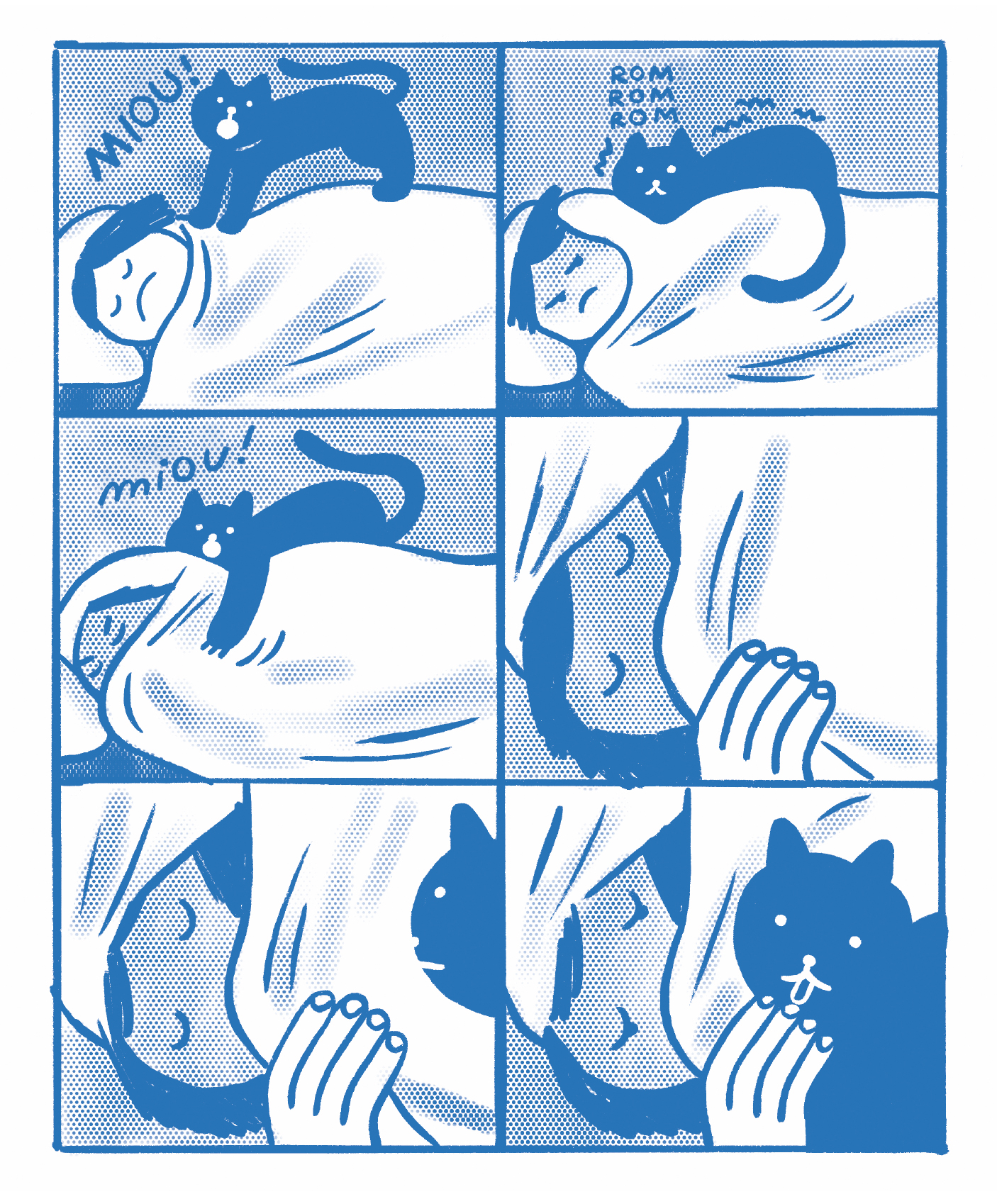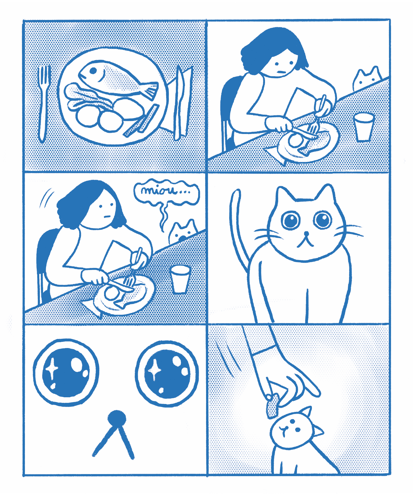 La fillette, âgée de 9 ans, gère ses animaux avec autonomie, tout comme ses activités journalières. Le dessin, simple mais expressif, permet à l’autrice de capturer les émotions de la petite héroïne du quotidien et de ses 2 chats.