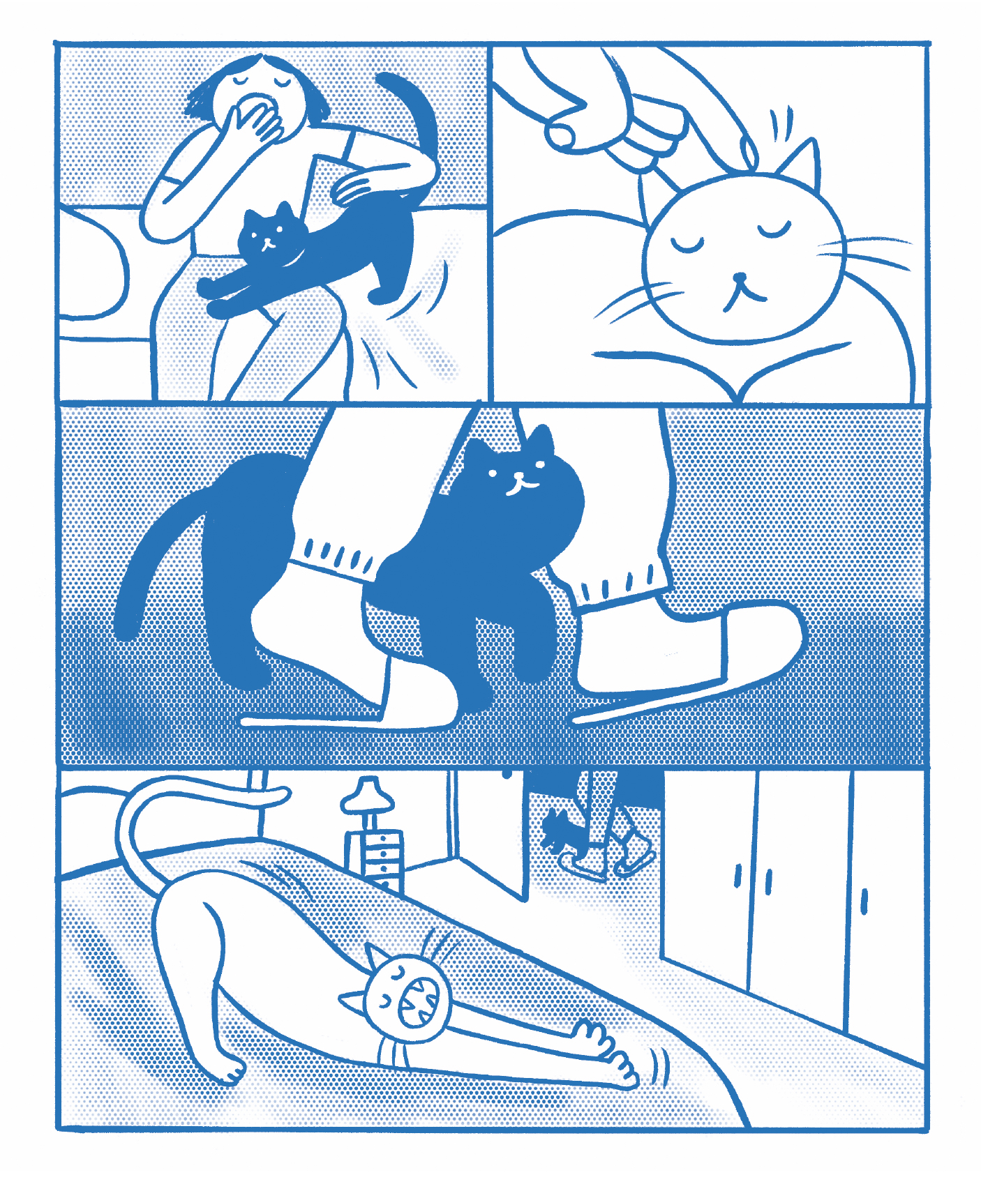 Dès les premières pages, on est frappé par la simplicité et l’expressivité du dessin. L’autrice parvient à capturer avec une grande justesse les émotions de la jeune héroïne et de ses compagnons félins. On suit leurs aventures du matin au soir, de l’école aux moments de jeu, en passant par les câlins et les petits tracas.