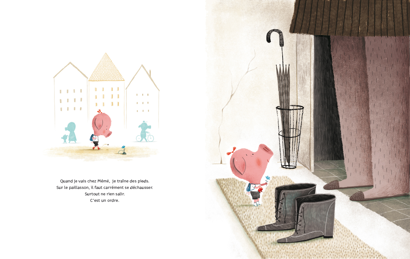 On y fait la connaissance d’une cochonette, un peu réticente à l’idée de passer du temps chez sa grand-mère, une femme au caractère bien trempé. Mais Mémé a une idée derrière la tête : initier sa petite-fille à faire du vélo, et pas n’importe comment, sans les petites roues !