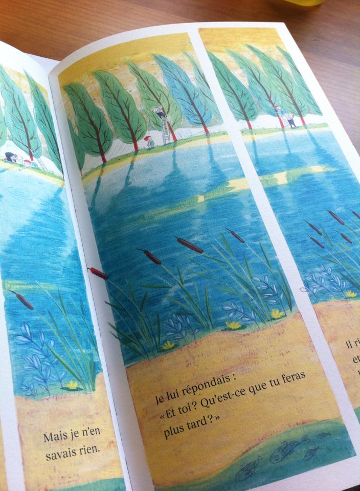 La narratrice relate ses souvenirs avec son grand-père, amoureux de la nature et de ses peupliers en particulier. Elle évoque les petits moments partagés, la récolte au potager, les promenades au bord du fleuve, le temps qui passe et son papi vieillissant. A la mort de celui-ci, c’est auprès de ses peupliers que la fillette avait trouvé du réconfort.