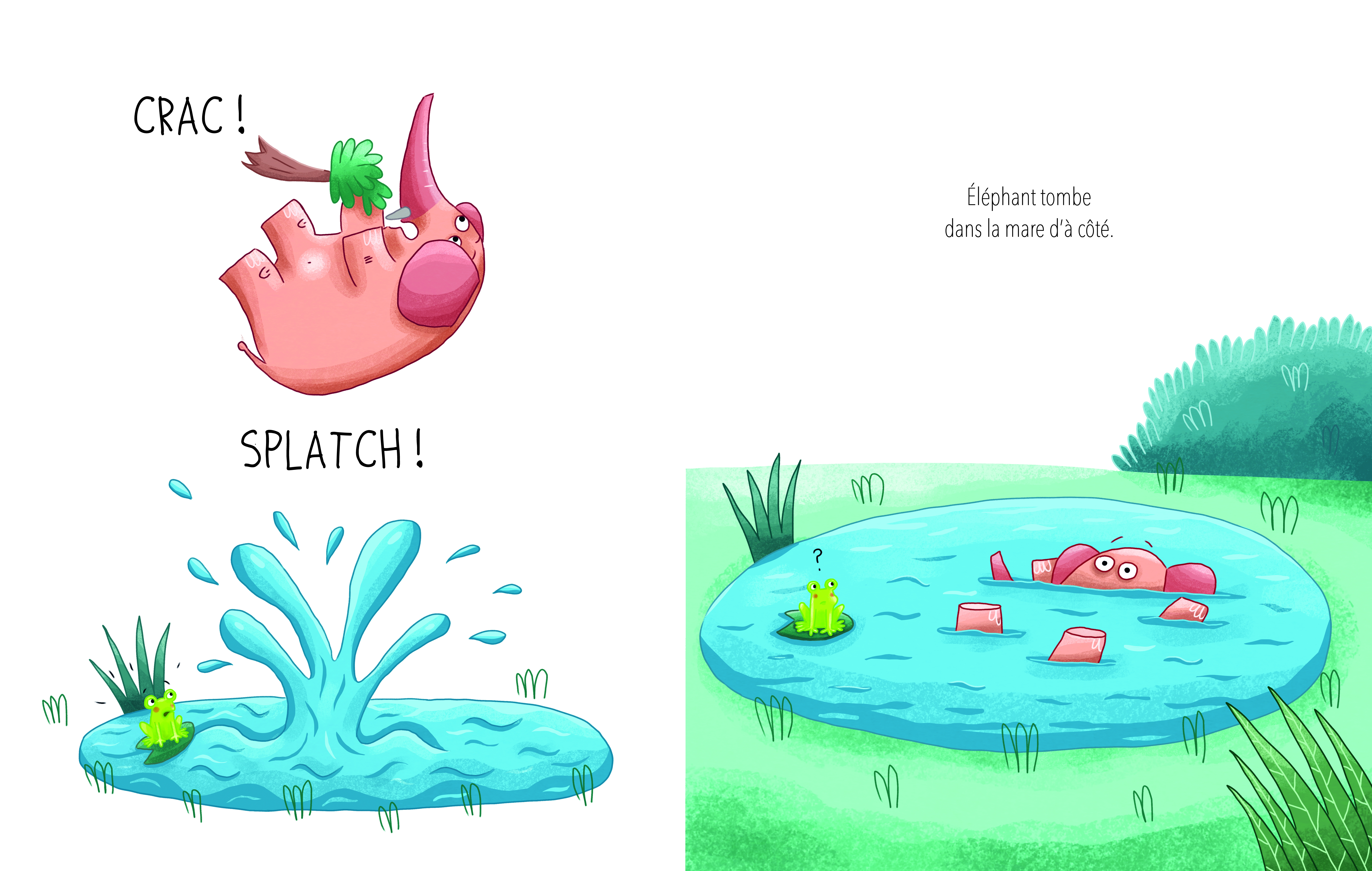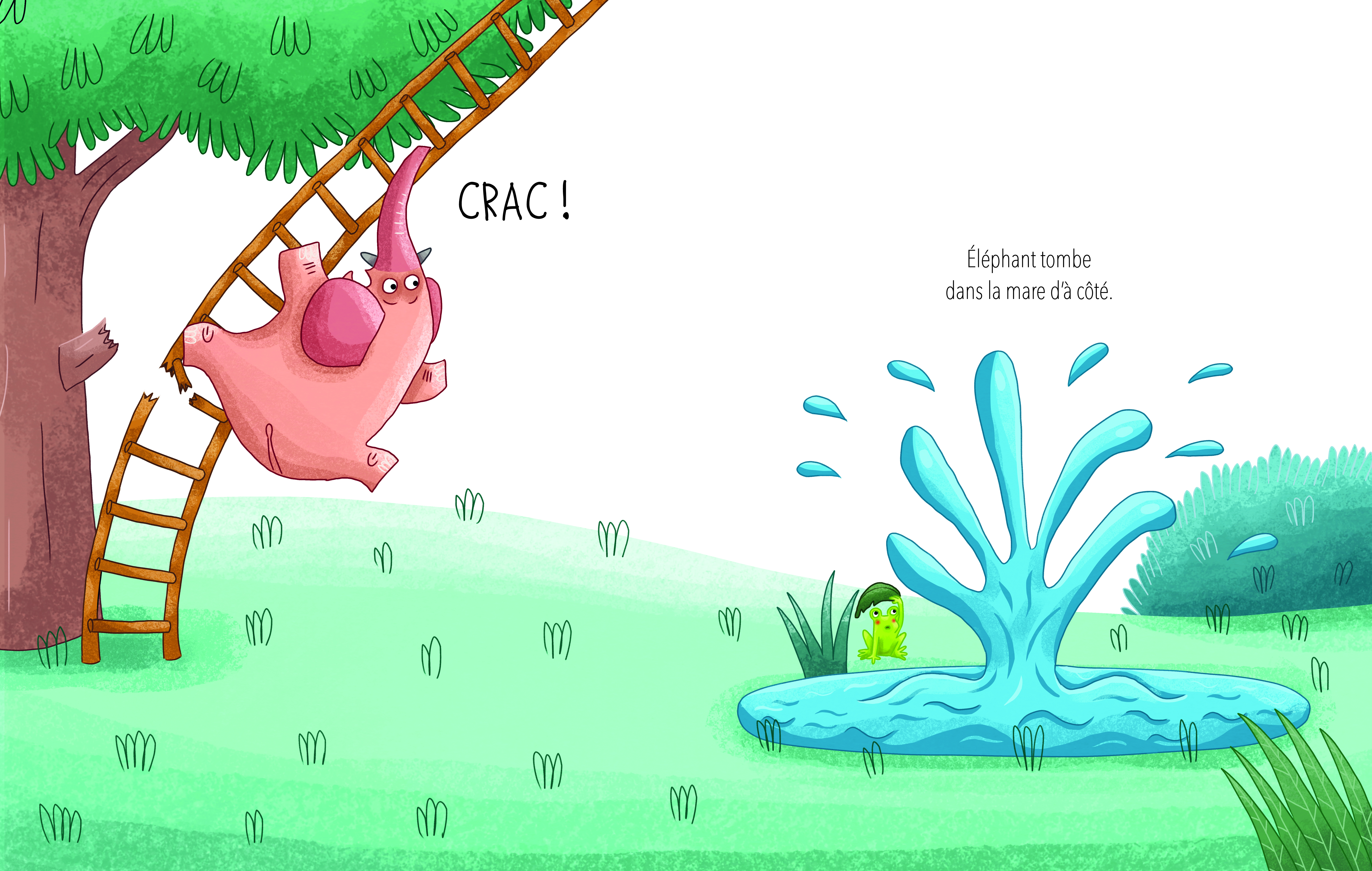 Les illustrations dâAnne Derenne, rĂ©alisĂ©es en numĂ©rique, sĂ©duisent immĂ©diatement par leur fraĂźcheur et leur expressivitĂ©. LâĂ©lĂ©phant rose, avec ses grands yeux ronds et son air tour Ă tour concentrĂ©, perplexe ou dĂ©pitĂ©, devient un compagnon de lecture dont on attend chaque nouvelle idĂ©e farfelue. Les scĂšnes de chute, soulignĂ©es par des onomatopĂ©es savoureuses (CRAC ! SPLATCH !), dĂ©clenchent de vrais Ă©clats de rire.