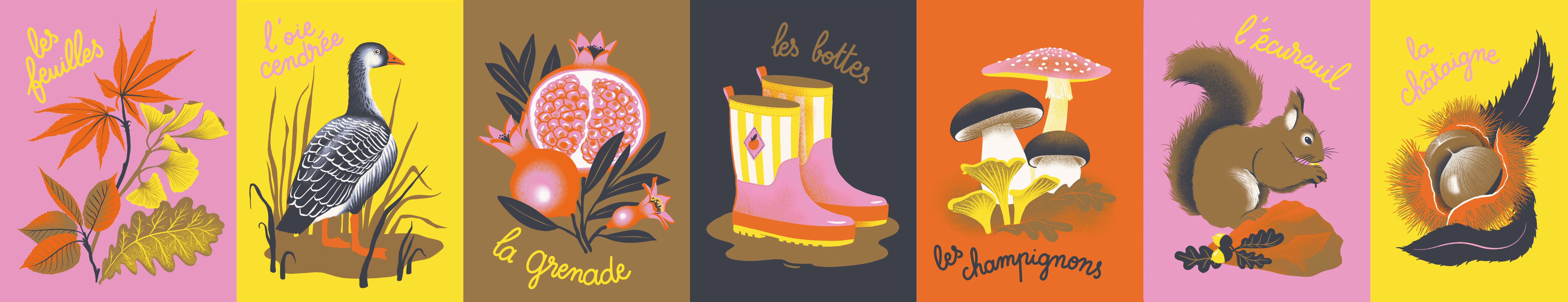 L’album joue avec les contrastes : couleurs franches, presque flamboyantes, et douceur des scènes du quotidien. On y retrouve les écoliers emmitouflés, la vigneronne qui récolte, l’écureuil affairé, les oies cendrées qui migrent vers d’autres ciels. C’est une ronde d’images et de mots, une promenade sensorielle où l’enfant observe, nomme, s’émerveille.