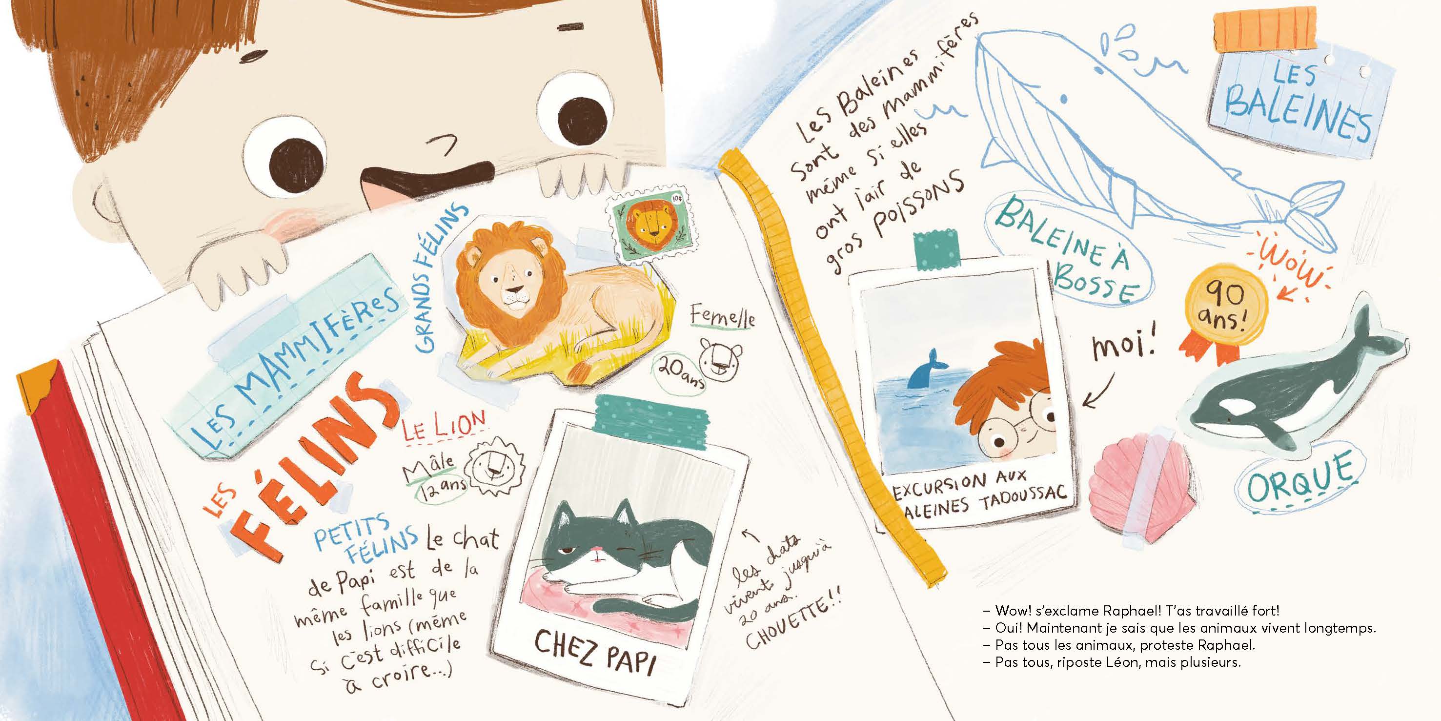 Léon est un petit garçon qui se découvre une passion pour les bestioles, les animaux et… leur longévité ! Quand sa maman lui offre un scrapbook pour y noter ses découvertes, le voilà lancé dans une enquête passionnée : insectes, félins, baleines, arbres majestueux… rien n’échappe à sa curiosité. Chaque page de son carnet devient un terrain de jeu scientifique, où l’observation côtoie l’imagination. Et quand il découvre que le séquoia géant peut vivre plus de 3000 ans, Léon croit avoir trouvé le champion toutes catégories. Mais c’était sans compter sur son papi, qui va lui souffler un secret encore plus vaste, encore plus grandiose…