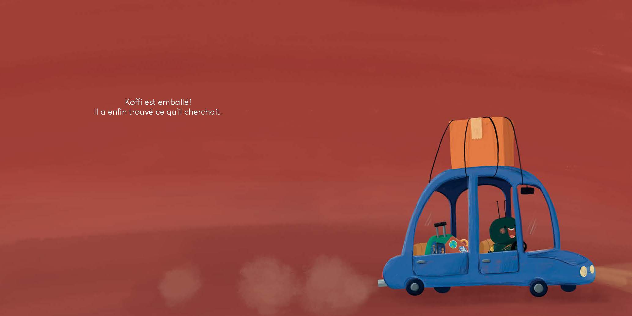 Faites la connaissance de Koffi, un petit coléoptère déterminé à trouver l’endroit idéal pour s’établir. Après des recherches, il déniche la maison qui lui semble parfaite en tout point! On le voit arriver, valises et boîtes empilées sur sa petite voiture bleue, le cœur rempli d’enthousiasme à l’idée de ce nouveau départ.