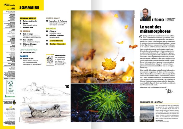 Si l’automne est arrivé avec ses couleurs flamboyantes, il est aussi l’heure de se plonger dans la nouvelle parution du magazine La Revue Salamandre (n°290), dont le titre est : « Le vent se lève ». Un numéro qui explore cet élément invisible, mais omniprésent, le grand souffle de la vie, qui ballade les oiseaux et façonne les paysages.