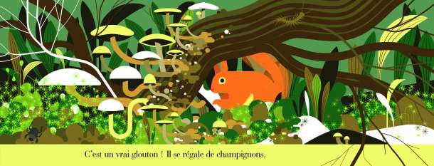 Cécile Jacoud choisit des phrases courtes, presque murmurées. L’enfant découvre l’écureuil dans ses gestes quotidiens : renifler un champignon, bondir de branche en branche, retrouver ses petits. L’écriture, poétique sans être complexe, suscite à la fois l’émerveillement et la connivence. On y entend le bruissement des feuilles, on y devine l’odeur des mousses.