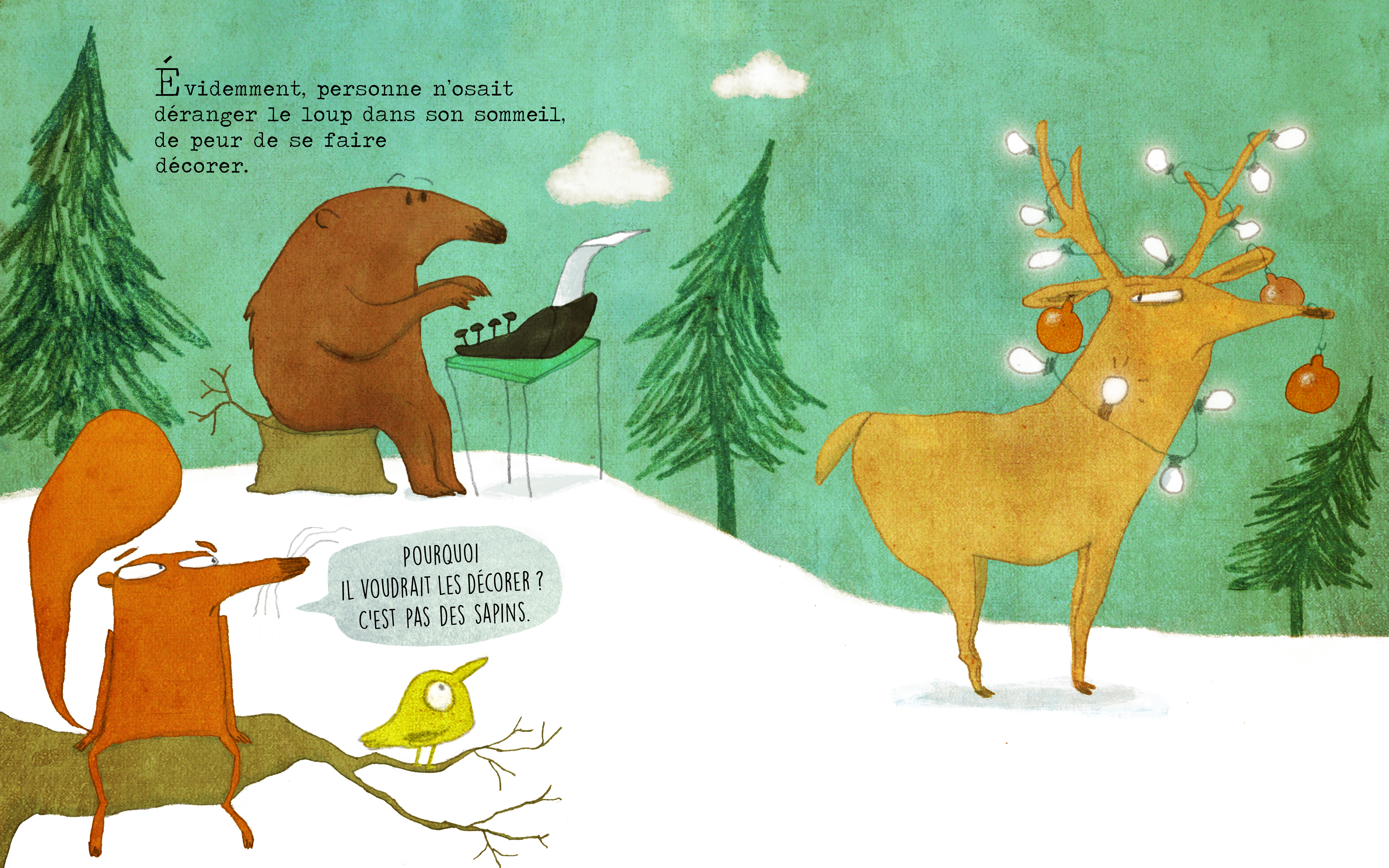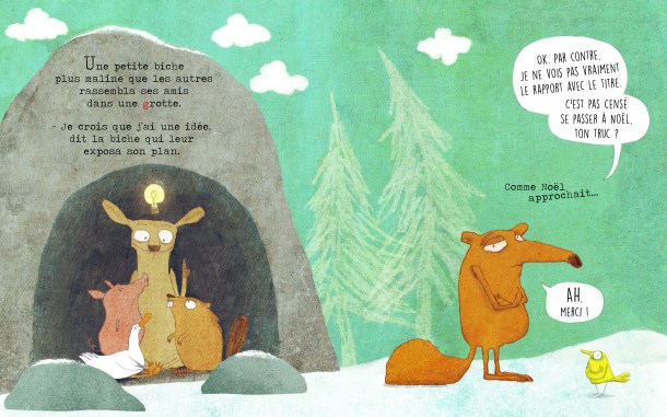 Comme dans le premier album, on s’amuse de la manière dont les images de Kris Di Giacomo illustrent littéralement les phrases, même quand elles n’ont aucun sens logique. Regardez ce pauvre cerf enguirlandé !
