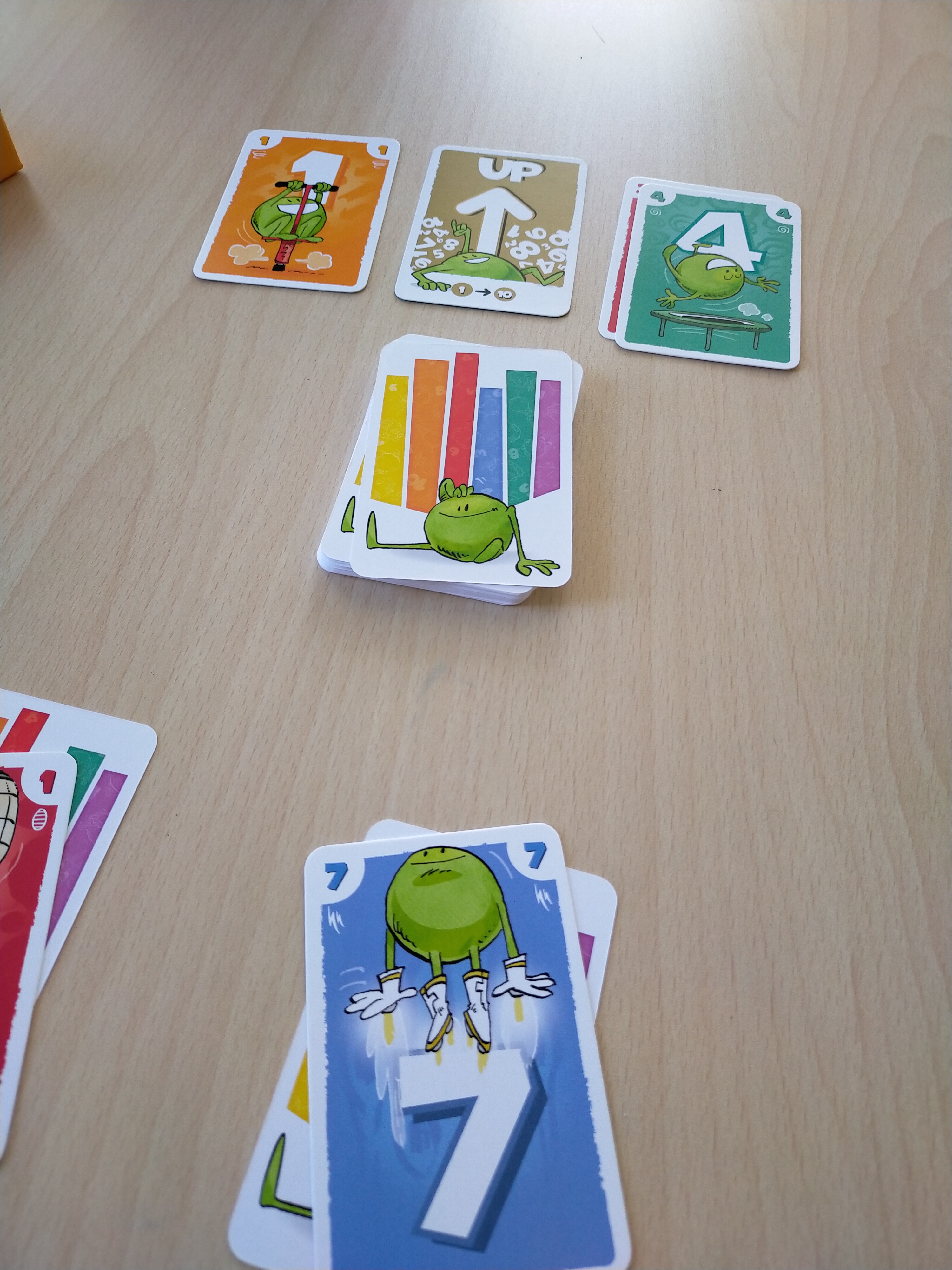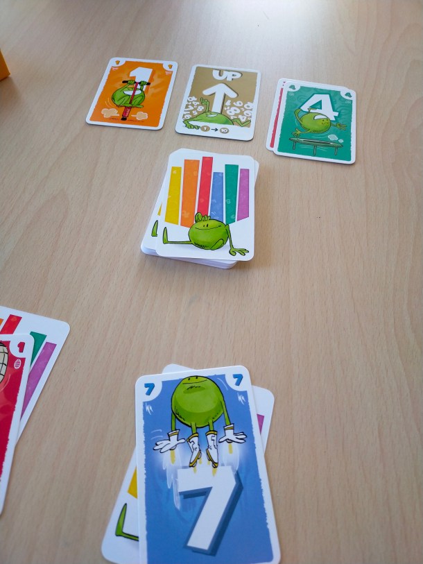 Le cœur du jeu repose sur les deux piles de défausse au centre de la table. À votre tour, vous devez jouer une carte de votre main ou de votre rangée visible en respecter le sens de la carte Up/DOwn placé au centre du jeu. Mais on peut aussi changer la donne en piochant 2 cartes et en changeant le sens du jeu avant de jouer une carte. Un geste tactique pour bloquer vos adversaires ou vous donner un avantage ! On pourra aussi s’amuser avec les couleurs : si on joue une carte de la même couleur que la précédente, on déclenche un bonus !